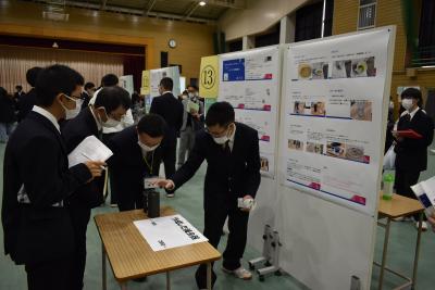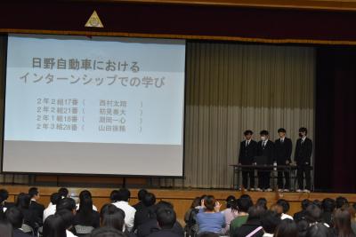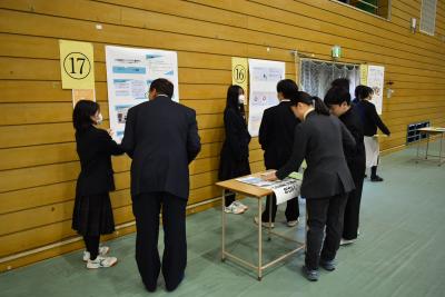 後半は体育館にて1年生は代表生徒による意見発表、2年生はインターンシップと環境学習ボランティアの体験発表、3年生は課題研究でこれまで研究してきた成果の発表を行いました。