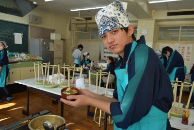 また、けんちん汁の歴史にも触れていただき、昔はタンパク質を取るためにウサギのお肉を汁の中に入れていたと聞いて、生徒はとても驚いた表情を浮かべていました。